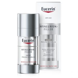Со новиот двокоморен систем за истовремено нанесување од два контејнера, Eucerin®Hyaluron-Filler ноќниот пилинг и серум овозможува соединувањето на двете високоефикасни формули да биде непосредно пред употреба.