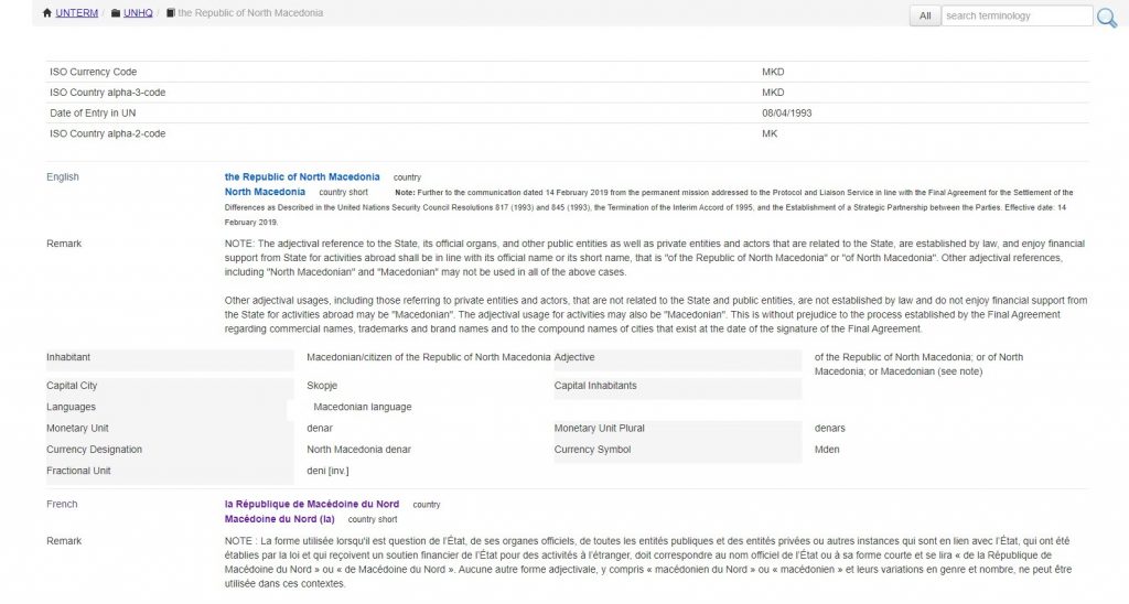 Во документот на UNTERM, како што се наведува во соопштението, се дадени основните информации за секоја земја: официјалното име, кратко име, јазик на држава, назив на валута, ISO кодовите и др.