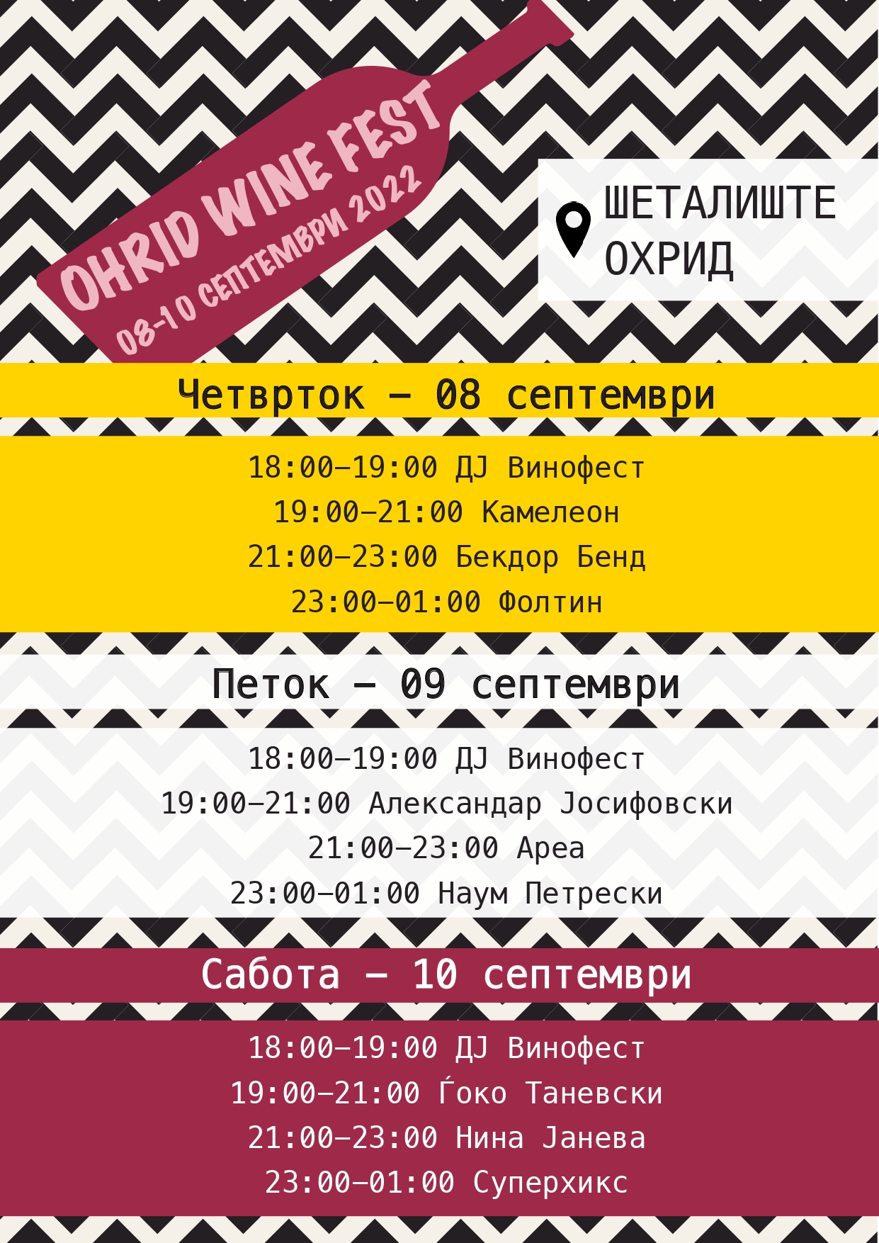 Покрај штандовите со квалитетно вино од македонските винарии, Општина Охрид соопшти дека за забава ќе бидат задолжени охридските бендови „Камелеон“ и „Бекдор бенд“, а свој настап ќе има и Ѓоко Танески. На Фестивалот ќе настапат и Дј Винофест, Фолтин, Александар Јосифовски, Ареа, Наум Петрески, Нина Јанева и Суперхикс.