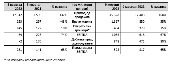 ЕБИТДА за првите девет месеци од 2022 изнесуваше 1.035 милиони денари, повисока за 67% во однос на истиот период минатата година, а добивката пред оданочување изнесуваше 848 милиони денари, што претставува зголемување од 80%, споредено со истиот период минатата година.