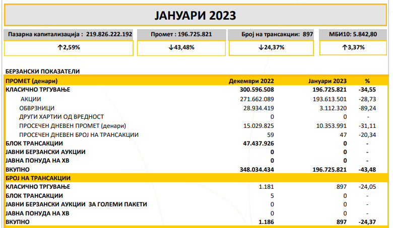 Македонската берза го објави билтенот за јануари, кој покажува пад на прометот и бројот на трансакции: