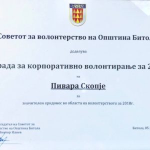 По повод Меѓународниот ден на волонтеризмот, Пивара Скопје доби признание за корпоративно волонтирање за 2018 година за успешниот едукативен проект – „За безбедни и здрави школски денови“.