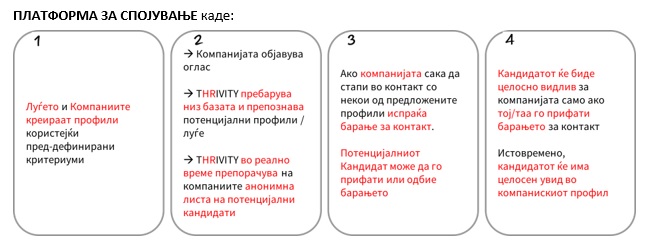 www.thrivity.mk е иновативна алатка за пребарување (“Search engine”) за луѓето кои бараат работа и компаниите кои вработуваат. Тоа е платформа за спојување, каде луѓето (индивидуални профили) од една страна и компаниите од друга страна креираат свои профили користејќи пред-дефинирани критериуми.