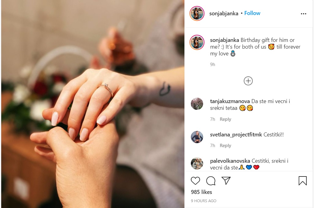 Арсовски сподели фотографија на која ја држи дланката на Соња со вереничкиот прстен, а во објавата напиша: „Доста беше, до вечноста“.