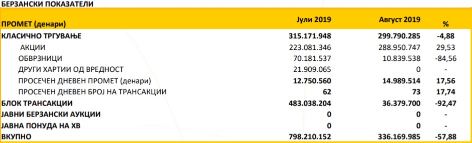 Имено, во јули вкупниот промет на берзата во август изнесувал изнесувал 798,2 милиони денари, што е намалување за 57,8 отсто во однос на јули кога берзата остварила промет од 336,1 милиони денари.