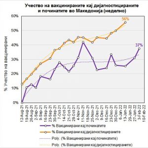 Во неделата од 28.01.2022 до 03.02.2022 година починале 73 целосно вакцинирани (37,4% од сите починати) и 122 невакцинирани (62,6%). Приближно ќе сметаме дека сите умрени биле постари од 60 години.