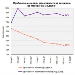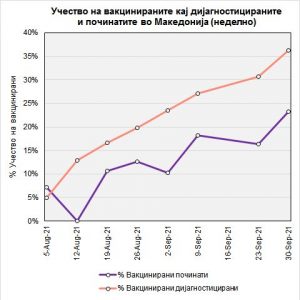 Во неделата 24.09 – 30.09.2021 уделот на вакцинирани кај заразените изнесувал 36,3%, при удел на целосно вакцинирани во возрасната популација (две недели претходно) од 39,9%.