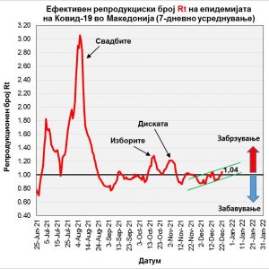 Неговата средна вредност од подединечна (Rt.sr<1) деновиве стана единечна (Rt.sr=1,0), со тенденција наскоро да стане надединечна (Rt.sr>1), што би значело дека дневните броеви на нови случаи во просек наскоро ќе започнат да се зголемуваат.