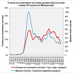„26.12.2021. Ефективниот репродукциски број Rt (на дијаграмот на првата слика), движејќи се осцилаторно меѓу двете зелени линии на трендот, сепак покажува благ нагорен тренд.