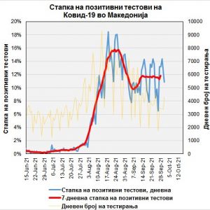 Конечно, на петтиот дијаграм забележуваме дека стапката на позитивни тестови никако не се намалува, а нејзиниот седумдневен подвижен просек денеска како да доби нагорен тренд.