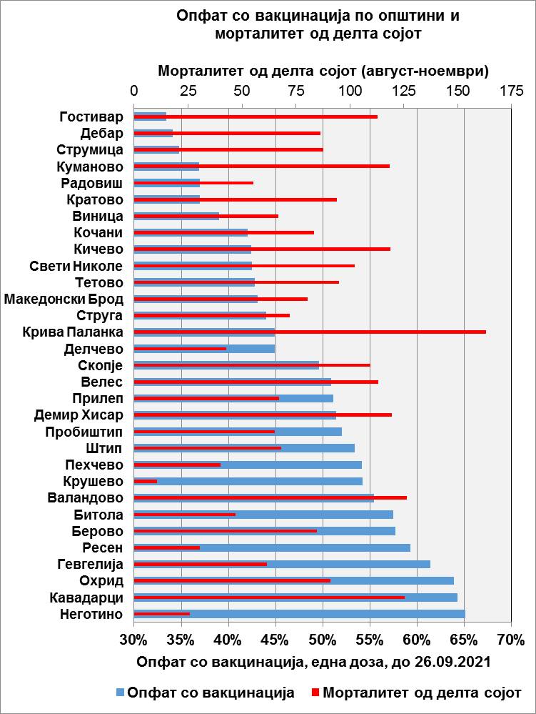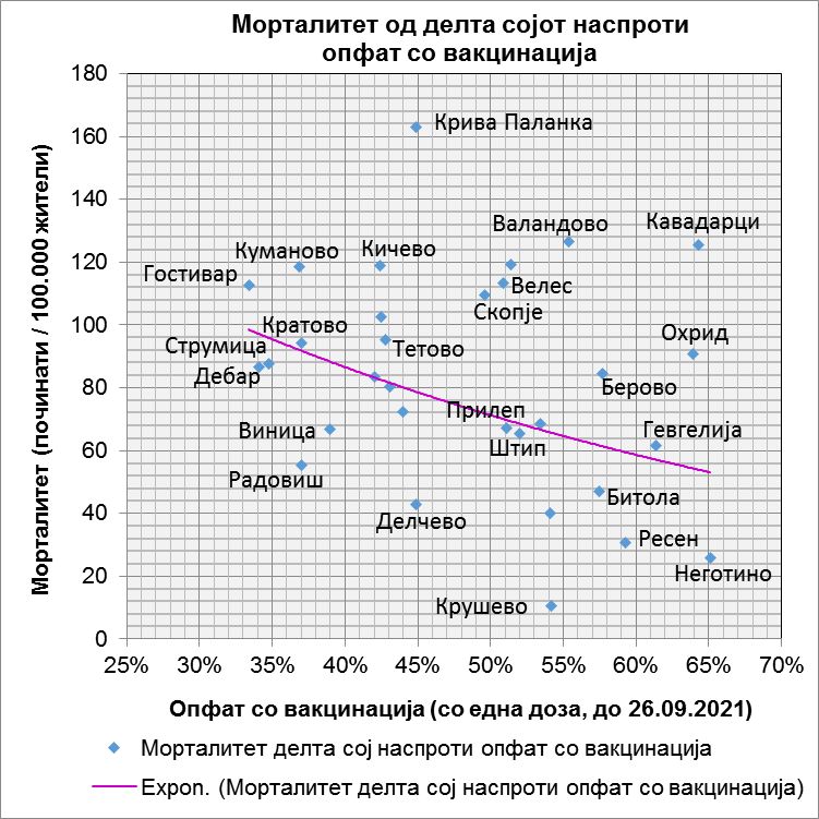 “Вакви дијаграми, коишто ја прикажуваат врската помеѓу морталитетот од делта сојот на 100.000 жители наспроти опфатот со вакцинација, видовме за државите од Европската Унија. Слична споредба гледаме на следните два дијаграми, за општините во Македонија.