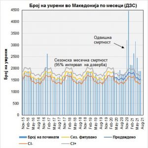 Во истиот период, според извештаите на ДЗС починале 36.255 лица. Оттука се добива одвишната смртност од 10.141 лица (со 95% интервал на доверба од 9.458 до 10.824 лица).