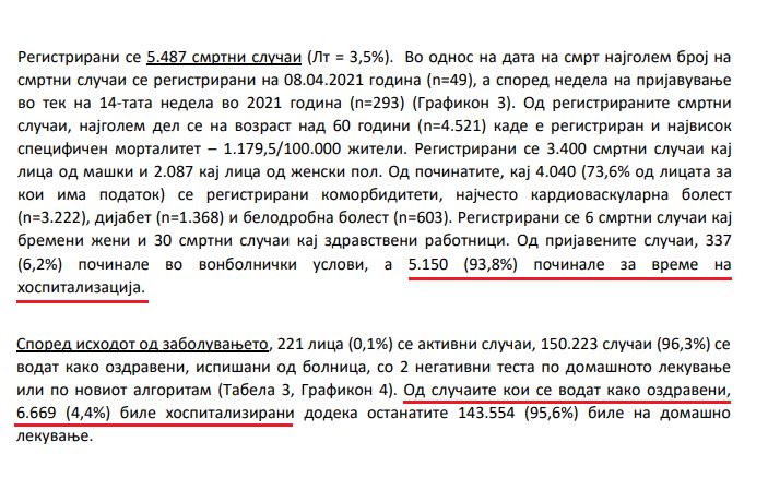 Според тоа, од сите коишто влегле во болниците починале 5.150 /11.851 = 43,45%, колку што изнесува стапката на болнички леталитет од Ковид-19 во македонските болници. Со други зборови, умреле безмалку половина од хоспитализираните.