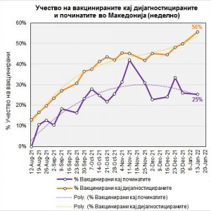 Последниве две недели кај вакцинираните се дијагностицирани 9.083 од 819,8 илјади лица (инциденца 791,4 заразени на милион вакцинирани дневно). Од друга страна, кај невакцинираните се дијагностицирани се 7.268 од 630,2 илјади лица (инциденца 823,8 заразени на милион невакцинирани дневно).