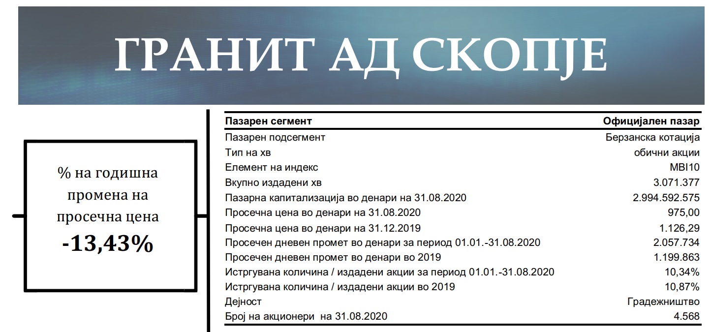Тие покажуваат дека заклучно со август годинава бил остварен вкупен промет со акциите на „Гранит“ во износ од 335 милиони денари или околу 5,4 милиони евра.
