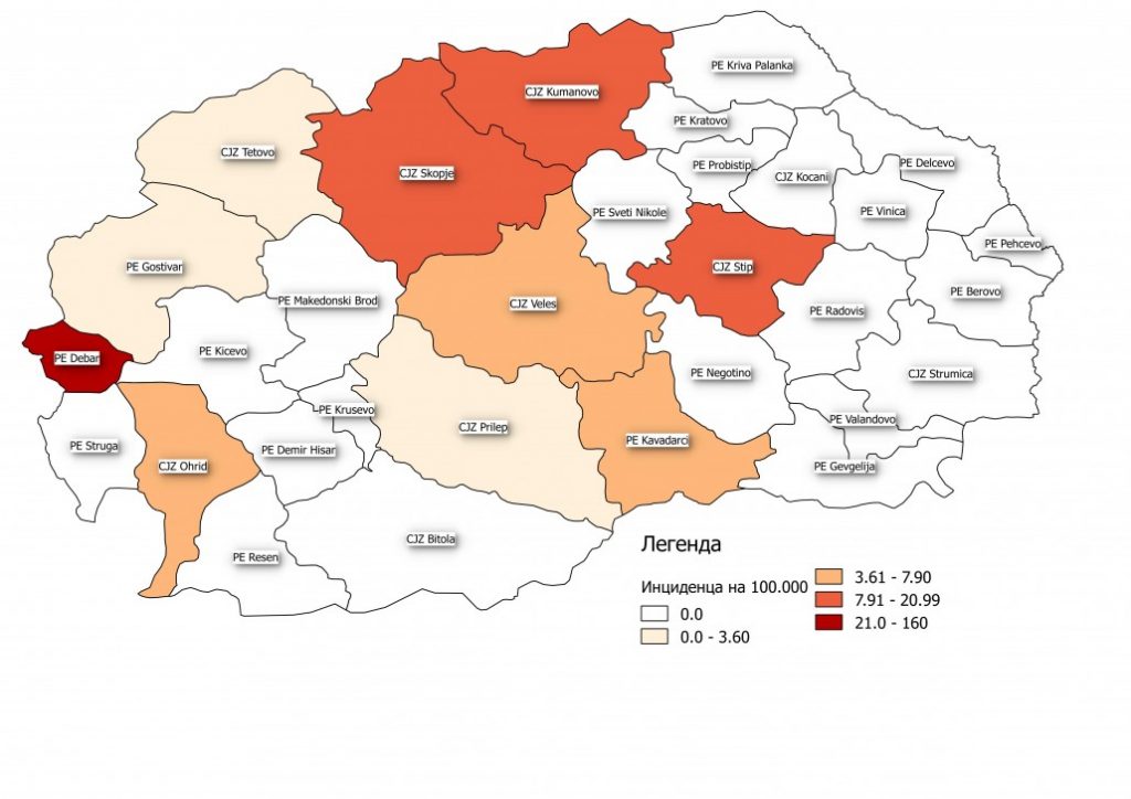 Највисока кумулативна инциденца на 100.000 жители се регистрира во Дебар со 154,9 заболени на 100.000 жители, а во Скопје инциденцата е 19,9 на 100.00 жители, додека во Штип инциденцата на 100.000 жители е 15,2“, стои во анализата на податоците на Институтот за јавно здравје.