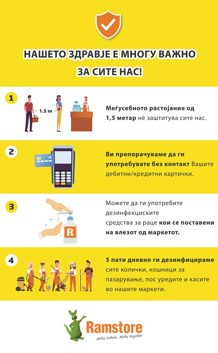 За таа цел, согласно препораките на СЗО, Рамсторе Македонија постојано потсетува и повикува на почитување на превентивните мерки, за грижата за јавното здравје како што се: одржување на меѓусебното растојание од 1,5 метар кое не зашитува сите нас ни овозможува зачувување на личното и колективно здравје, за поголема заштита и намалени контакти препорака до своите потрошувачи да користат бесконтактно плаќање без да се внесе пин код заштитувајќи се себеси и другите како и поедноставно спроведување на плаќањата.