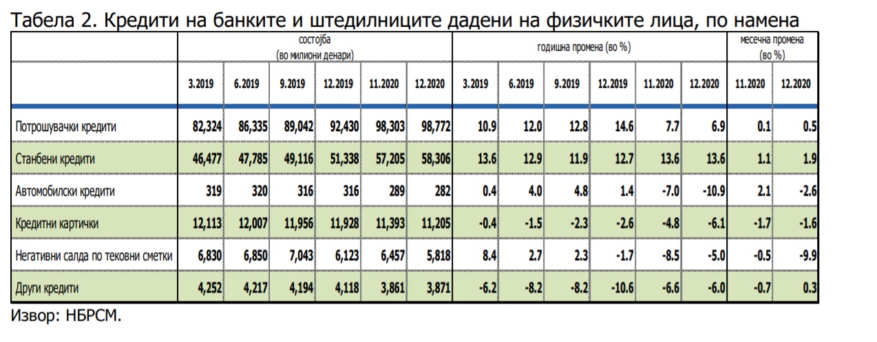 Анализирано според намената на кредитите одобрени на физичките лица во декември, кај најзастапените категории – потрошувачките и станбените кредити, забележан е месечен раст од 0,5% и 1,9%, соодветно, како и годишен раст од 6,9% и 13,6%, соодветно, соопшти Народната банка.