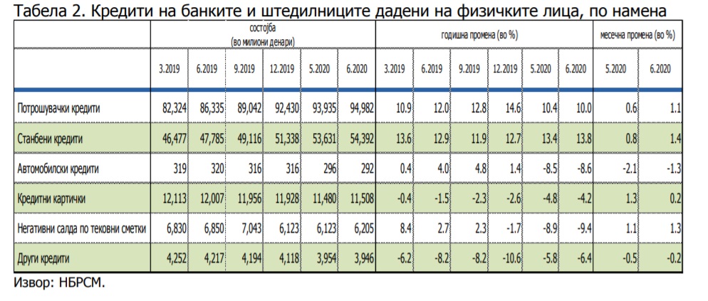 Во јуни, гледано според намената на кредитите одобрени на физичките лица, потрошувачките кредити и станбените кредити, како најзастапени категории, забележаа раст од 1,1% и 1,4%, на месечно ниво, и 10,0% и 13,8%, на годишно ниво, соодветно, соопшти Народната банка.