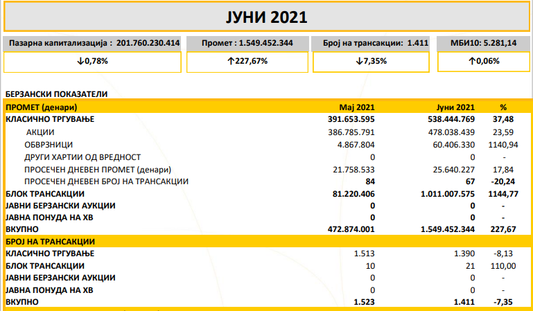 Македонската берза го објави месечниот билтен за јуни, од кој може да се види дека има раст на прометот за 227,67%, а пад на бројот на трансакциите за 7,35%.