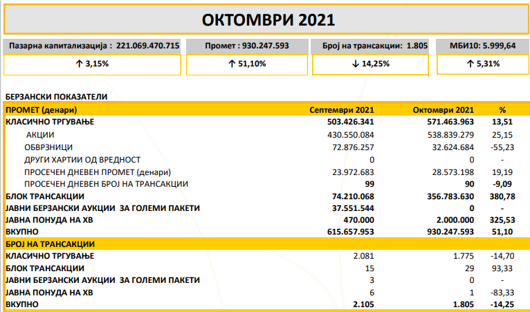 Македонската берза го објави билтенот за октомври, од кој може да се види дека за тој период имало раст на прометот и пад на бројот на трансакциите.