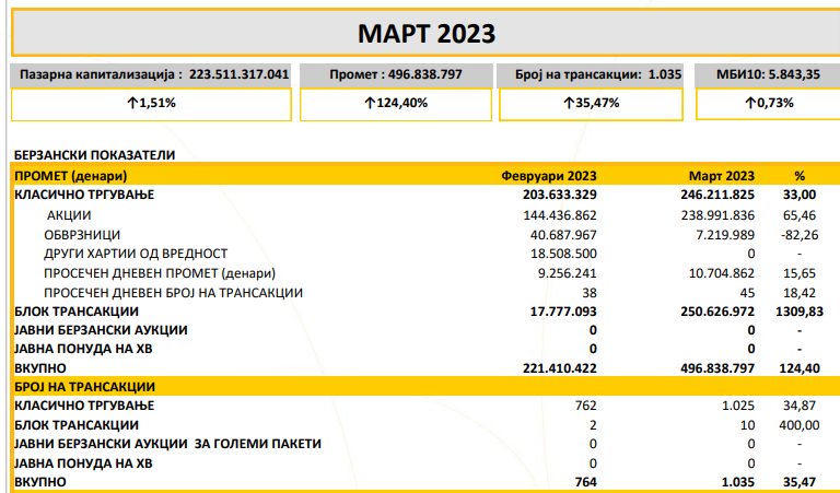Македонската берза го објави билтенот за март, кој покажува раст на прометот за 124,40% и раст на бројот на трансакции за 35,47%.
