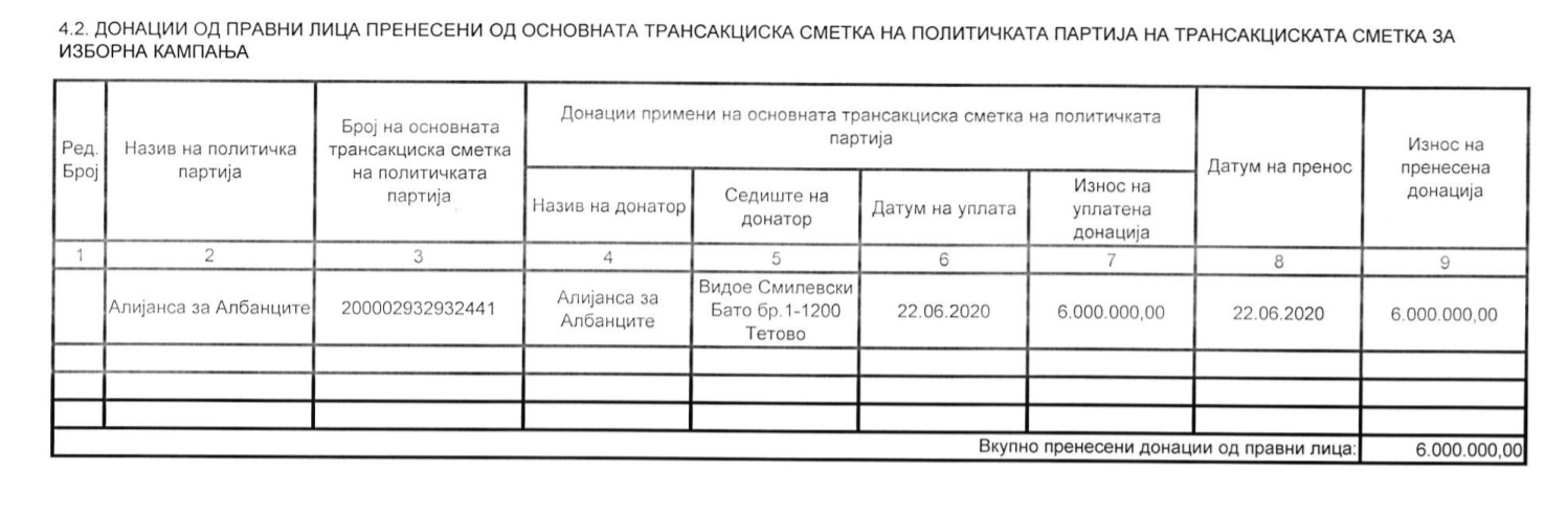 Инаку, Алијансата за Албанците е единственото правно лице кое донирало 6.000.000 денари за изборната кампања од сметката на партијата, па така вкупните приходи на сметката за изборната кампања од донации изнесуваат 6.001.000 денари или околу 97.000 евра.