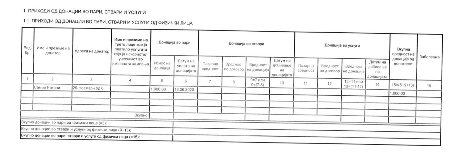 Самир Ракипи е името на единственото лице кое донирало пари за изборната кампања на Алијансата за Албанците и Алтернатива за предвремените парламентарни избори 2020, покажуваат партиските извештаи за примените донации што ги објави Државниот завод за ревизија.
