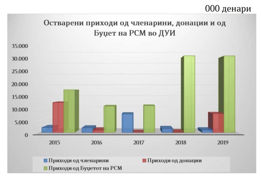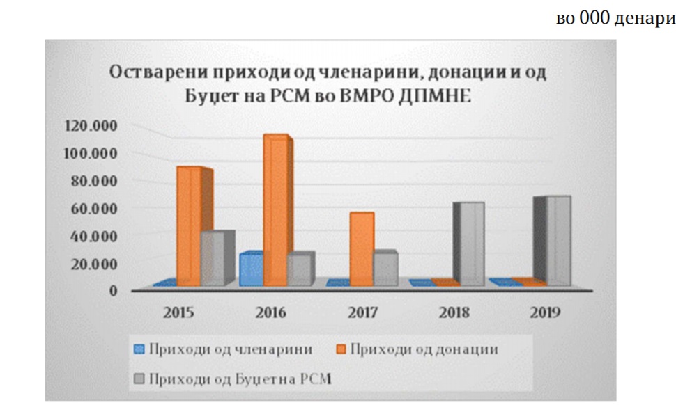 Со анализата на вкупните приходи по видови на извори на финансирање, ДЗР утврди дека учеството на јавното финансирање од Буџетот на РСМ на редовното работење на ВМРО-ДПМНЕ бележи тренд на зголемување и тоа од 27 проценти во 2016 година до 67 отсто во 2019 година, наспроти тренд на опаѓање на учеството на приватните извори на финансирање (членарини и донации) во вкупните приходи на партијата.