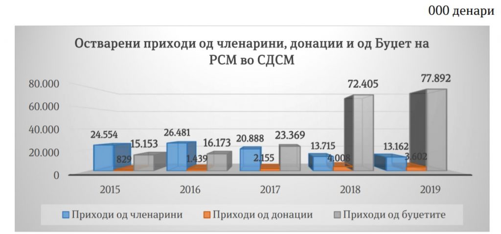 Со анализата на вкупните приходи по видови на извори на финансирање, ДЗР констатира дека учеството на јавното финансирање од Буџетот на РСМ на редовното работење на СДСМ бележи тренд на зголемување и тоа од 37 проценти во 2015 година до 82 отсто во 2019 година, наспроти тренд на опаѓање на учеството на приватните извори на финансирање во вкупните приходи на партијата.
