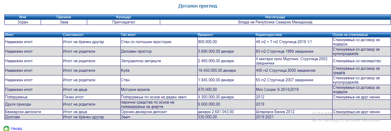 Во новиот анкетен лист пак го нема депозитот на неговата сопруга, но на нејзино име има заем од 330 илјади денари, а истиот треба да го врати до 2021 година.