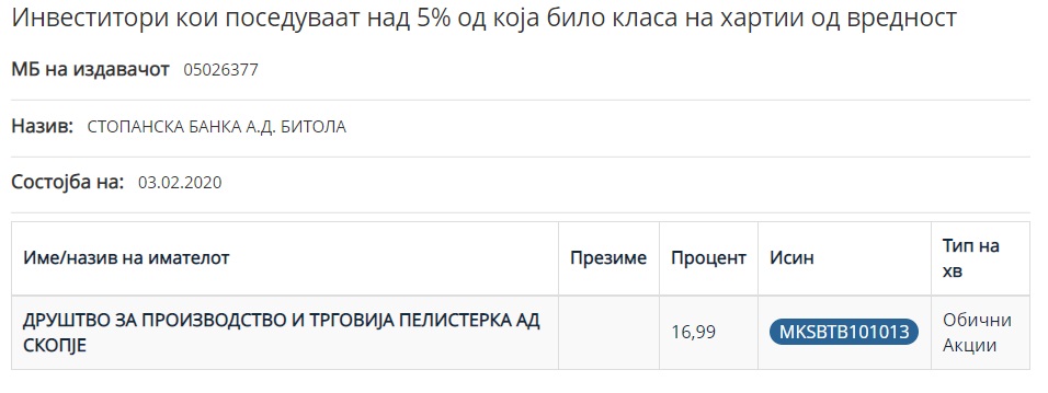 Имено, тие тогаш соопштија дека Самсоненко поседува 19.500 акции од банката односно 4,98 отсто од вкупниот број акции, а „Руле турс“ поседува 15.966 акции односно 4,08 отсто од сопственоста во банката.