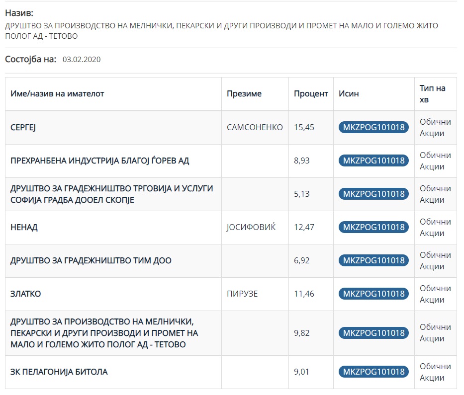 Рускиот бизнисмен Сергеј Самсоненко стана најголем поединечен акционер во „Жито Полог“ АД Тетово откако се стекна со 5.000 обични акции и сега поседува вкупно 8.650 обични акции, што претставува 15,45 % од вкупниот број на издадени акции на друштвото.