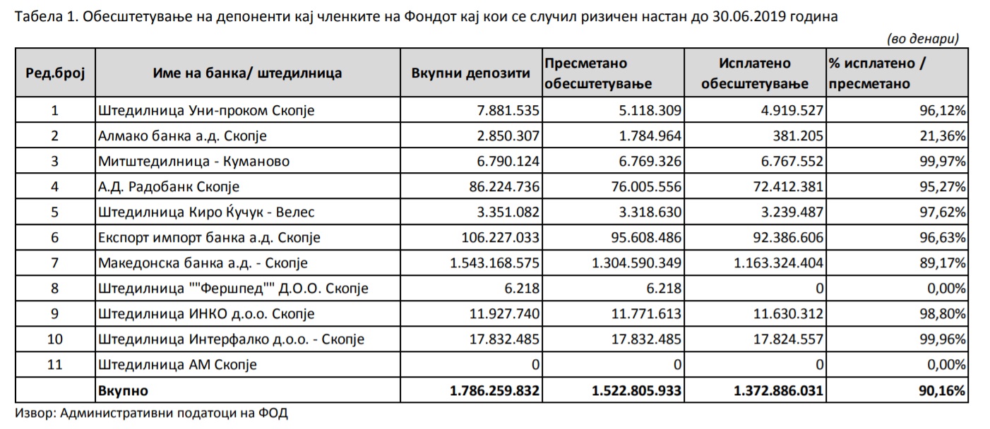 Во првата половина на 2019 година вкупно се исплатени 6 штедачи во вкупен износ од 44,3 илјади денари. Сите исплатени штедачи биле депоненти на Македонска банка а.д. Скопје во ликвидација.