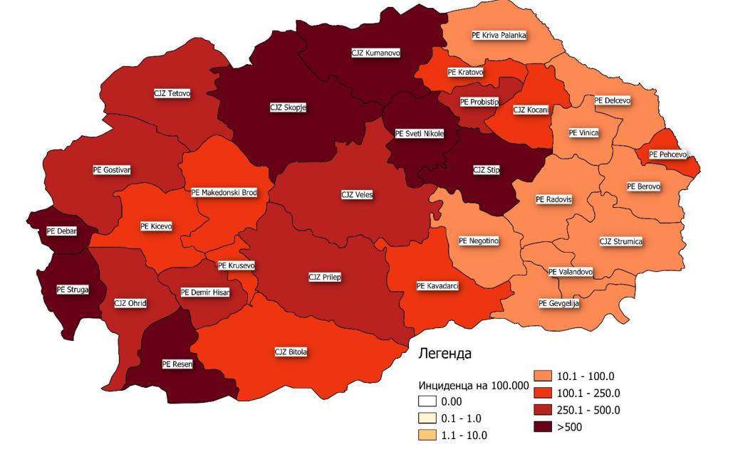 “Највисока кумулативна инциденца на 100.000 жители се регистрира во Штип со 1.444,8 заболени, Свети Николе со 1.057,9 на 100.000 жители, Ресен (874,5/100.000), Скопје (754,5/100.000), Куманово (694,5/100.000), Дебар (691,8/100.000), Струга (613,1/100.000), додека инциденца со над 250 заболени на 100.000 жители е регистрирана во Тетово, Охрид, Прилеп, Гостивар, Велес, Пробиштип и Демир Хисар“, стои во извештајот на ИЈЗ, кој еМагазин редовно го пренесува.