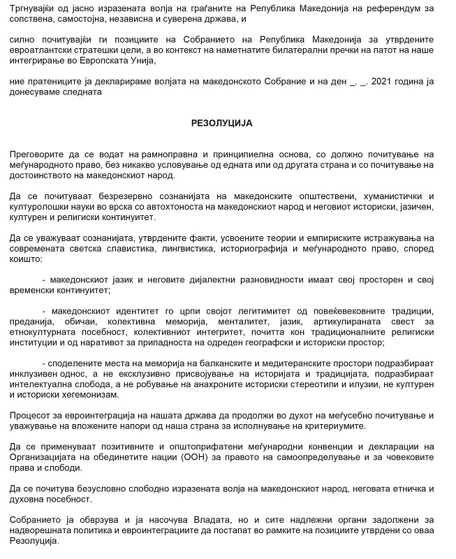 Од партијата бараат национален и општествен консензус за предлог-резолуцијата и посочуваат дека истата не е авторски текст на ВМРО-ДПМНЕ, туку дека во неа се содржани јавните ставови на МАНУ, УКИМ И МПЦ ОА – Јустинијана Прима.