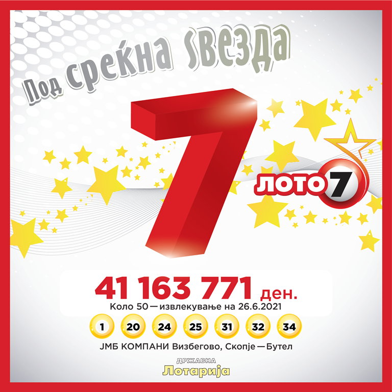 Ја поздравуваме одлуката на лото-играчите коишто досега јавно го споделија своето искуство – да се добие 7-ка на лото. Веруваме дека наскоро ќе се запознаеме и со нашиот најнов добитникот и ќе ви ја пренесеме среќната приказна на лото-играчот чиишто среќни броеви му донесоа добивка во износ од 41.163.771 60 денари, за уплатени 200 денари.