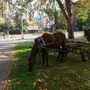 Граѓани на социјалната мрежа „Фејсбук“ постираа фотографии од коњ врзан за запрежна приколка како јаде трева од тревник веднаш до булеварот Климент Охридски во строгиот центар на градот.