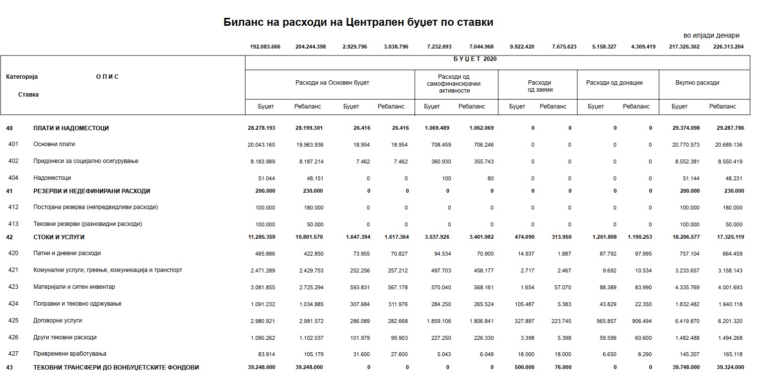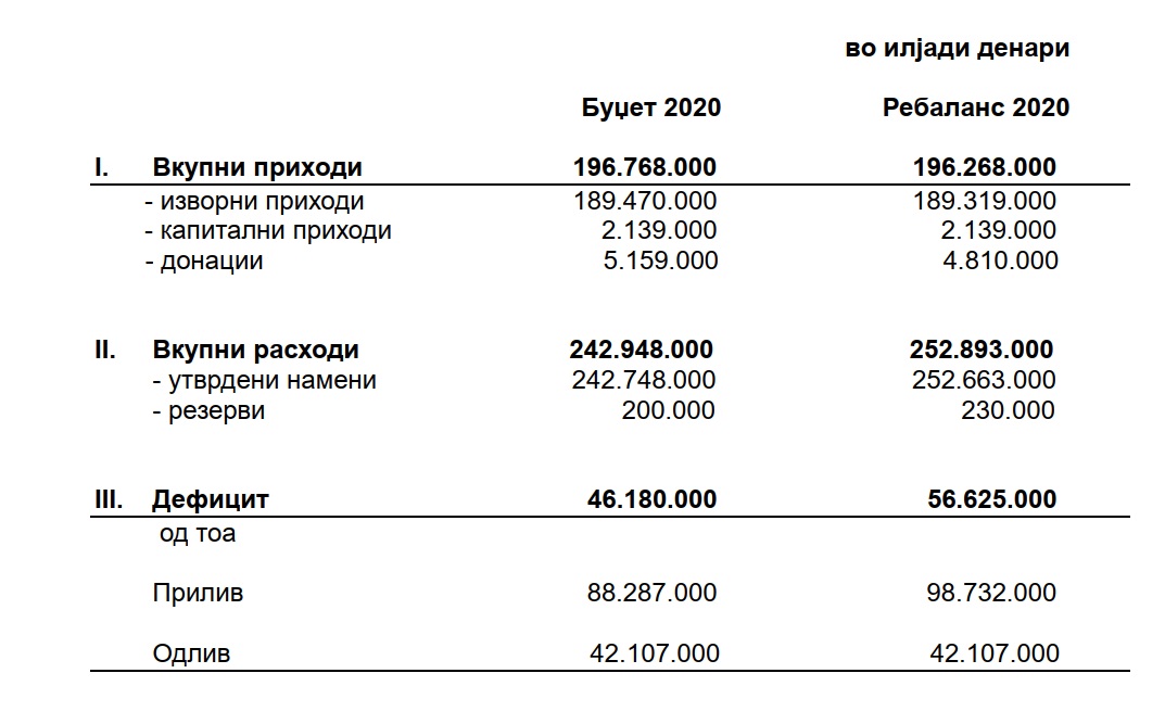 Во Собранието пристигна предлогот за ребаланс на буџетот за 2020 година во кој вкупните расходи се планирани на ниво од 253 милијарди денари (4,1 милијарди евра) што е зголемување за 10 милијарди денари (околу 162 милиони евра) во однос на претходните буџетски проекции за годинава во кои расходите изнесуваа 243 милијарди денари или околу 3,9 милијарди евра.
