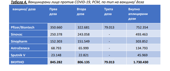Според Институтот за јавно здравје, заклучно со 4. декември оваа се видовите на вакцини против Ковид-19 кои ги примиле граѓаните во Македонија: