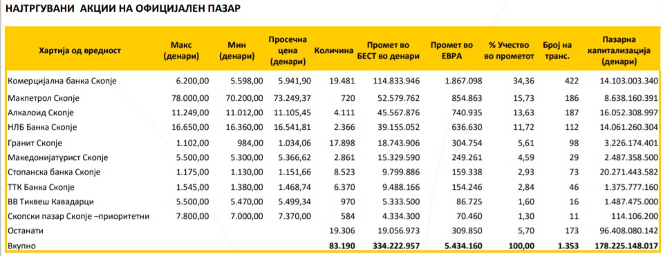 На второто место на листата најтргувани се акциите на „Макпетрол“ со промет од 854.863 евра, а на третото место акциите на „Алкалоид“ со промет од 740.935 евра.