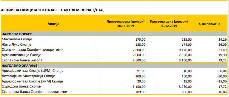 Оваа се акциите со најголем пораст и пад на Македонската берза во декември според Билтенот на Македонската берза:
