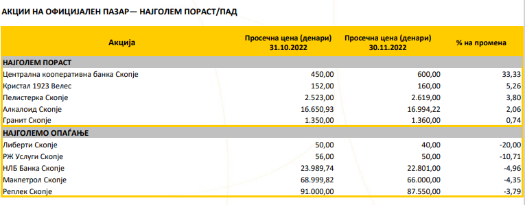 Македонската берза го објави билтенот за ноември, а оваа се Топ 5 акции со најголем раст и пад: