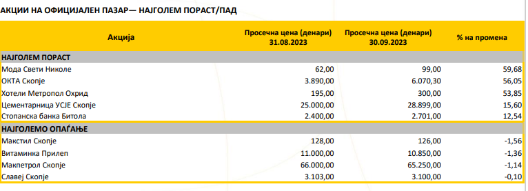 Македонската берза го објави билтенот за септември, а оваа се акциите со најголем раст и пад за тој период: