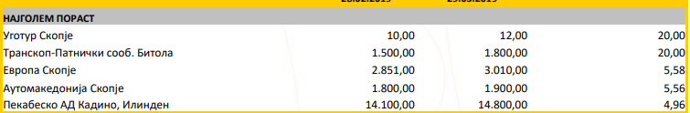 Според билтенот на Македонската берза за март, оваа се акциите, кои котираат на официјалниот пазар, со најголем раст минатиот месец: