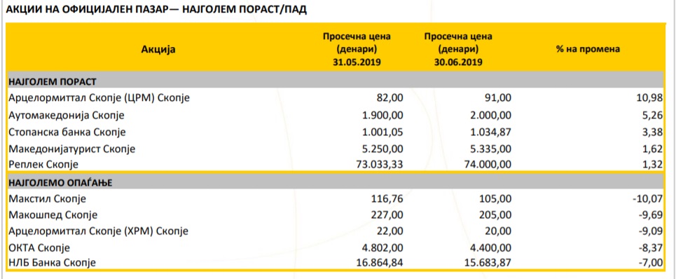 Македонската берза го објави билтенот за јуни, годинава во кој може да се забележи дека најголем пораст на вредноста имале акциите на Арцелор Миттал Скопје (ЦРМ), Аутомакедонија,Стопанска банка Скопје, Македонијатурист и Реплек.