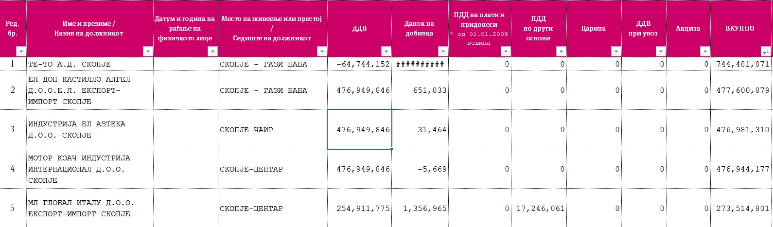 Управата за јавни приходи (УЈП) ја објави новата листа на должници за долгови доспеани до 31.05.2020 и неплатени до 31.08.2020 година по основ на ДДВ, данок на добивка, персонален данок на доход, придонеси од задолжително социјално осигурување, акцизи и царини.