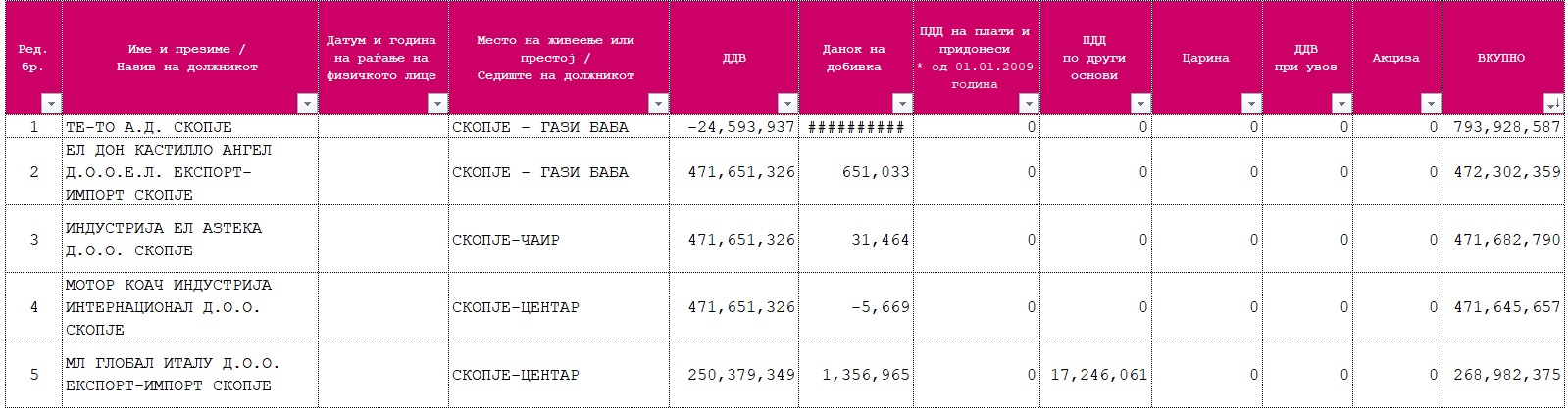 На врвот на листата е компанијата ТЕ-ТО со вкупен долг од 793,9 милиони денари или околу 12 милиони евра.