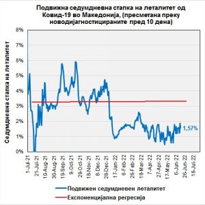 Како што гледаме од четвртиот дијаграм, стапката на леталитет од пристигнувањето на омикрон сојот цело време се движи во просек околу 1,5%, без тенденција за намалување, што секако не е добра вест.