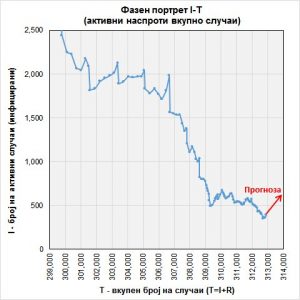 Веќе 4 дена едноподруго имаме секој ден сé поголеми дневни броеви на нови случаи, споредено со 7 дена претходно. На втората слика, фазниот портрет I-T (активни наспроти вкупно случаи) убаво се отцртува долот, крајно десно на дијаграмот.